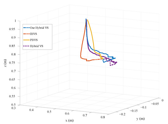 According to Figure 7, DHVS (the blue path) has a shorter camera path than HVS (the purple path) and IBVS (the red path). To elaborate, the camera (or the robot EE) travelled 0.843 m distance in DHVS; however, this value is 0.942 m and 0.917 m in IBVS and HVS, respectively. In PBVS, the camera travelled distance is 0.722 m, which provides the most optimised Cartesian trajectory of the robot EE, as predicted.
