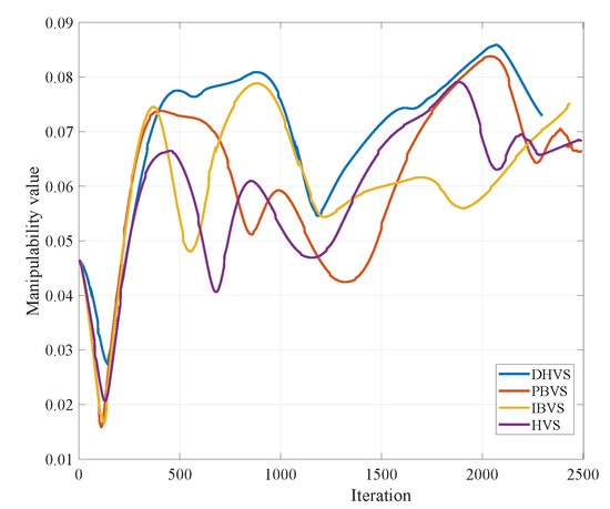 Four different visual servoing methods (DHVS, IBVS, HVS, PBVS) have been used to track the object. Figure 8 depicts the amount of manipulability for the VS methods. As shown in Figure 8, the manipulability of the DHVS method was mostly greater than the other three methods. The manipulability value at the time zero is the same since the robot started moving from the same position with an identical configuration during all trials. The minimum amount of manipulability for the DHVS method is 0.0681, while this amount is 0.0588 for IBVS, 0.0613 for PBVS and 0.0628 for the HVS method.