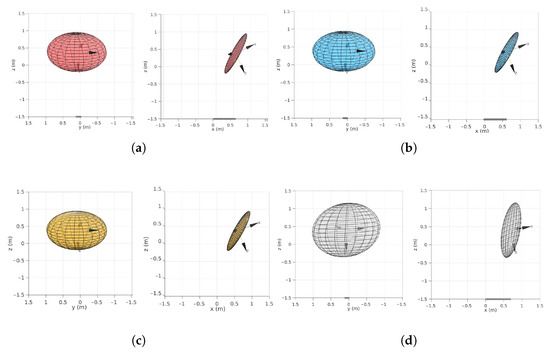 Manipulability ellipsoid in its minimum amount for three translation degrees of freedom in different VS approaches. (a) The manipulability ellipsoid of the robot in its minimum value with the PBVS approach. (b) The manipulability ellipsoid of the robot in its minimum value with the IBVS approach. (c) The manipulability ellipsoid of the robot in its minimum value with the HVS approach. (d) The manipulability ellipsoid of the robot in its minimum value with DHVS approach.