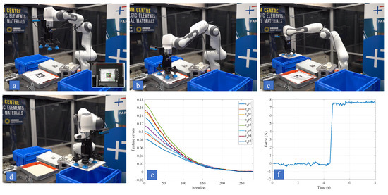 DHVS method is used for tracking the visual features attached to a Lithium-ion battery. Manipulability is considered as a secondary task for the controller. By using the proposed DHVS, the robot arm performs the task of sorting the battery; (a) the robot will follow the visual features of the object online; the tracked path of each feature is shown in the camera screen. (b) The robot goes down straight to detect the surface by the force feedback. (c,d) The object has been lifted by the vacuum suction gripper, and then released the battery in the corresponding basket. (e) The feature errors converged to zero during Visual Servoing. (f) The force value in the Z-axis for detecting the object surface.