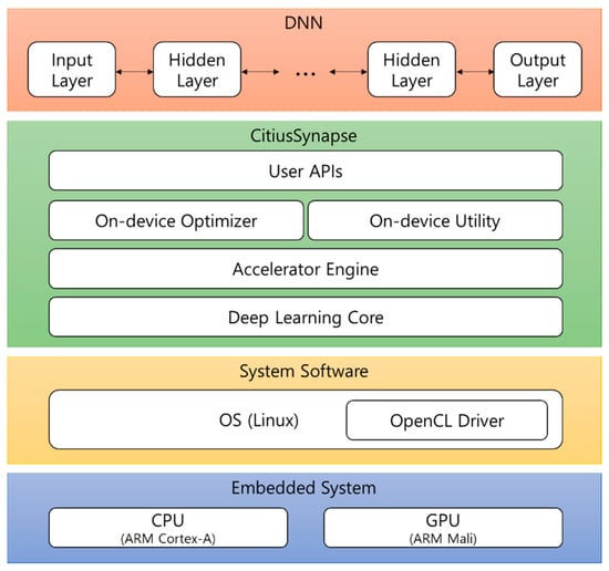 Deep neural networks (DNNs) have been widely adopted in various fields, such as in image and character recognition and object detection [,,,,,,,,,]. Driven by the increasing popularity of embedded systems, such as smartphones, active research is being conducted to explore on-device deep learning in embedded systems [,,,,]. When compared with standard PC and server platforms, embedded systems have smaller amounts of memory, fixed-size storage devices, and low-power processors. Furthermore, embedded systems have a different computational operation processing architecture than PC/server platforms in terms of their central processing unit (CPU), graphics processing units (GPUs), and memory structure. In addition, various types of associated hardware (HW) platforms have been developed, according to diverse applications. However, most deep learning frameworks (PyTorch [], TensorFlow [], Caffe [], etc.) are currently optimized for PC server platforms with abundant system resources. In particular, conventional deep learning frameworks use CUDA [] or cuDNN [] to accelerate deep learning operations, and are thus dependent on specific GPU hardware, such as Nvidia GPUs.