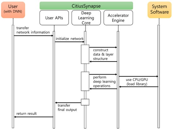 Figure 2 shows the interaction flow of each component of our framework. First, the user sends network information to the user API of our framework (=CitiusSynapse) to perform inference (or training). Second, the user API initializes the network through the deep learning core. Third, the deep learning core constructs data and layer structures in conjunction with the accelerator engine. Fourth, the deep learning core executes deep learning operations that are necessary for inference or learning through an accelerator engine. At this time, the accelerator engine uses a CPU or GPU driver for operation. Finally, the deep learning core returns the final output to the user through user APIs.