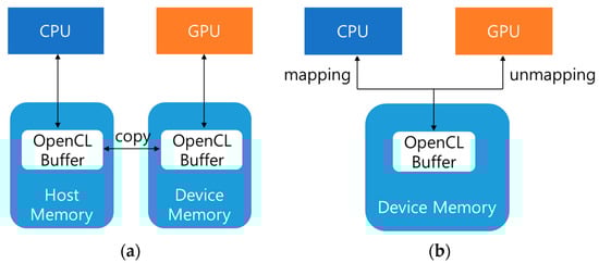 As shown in Figure 3a, a standard PC has a separate memory for the CPU (host) and GPU, in which the OpenCL buffer that is generated in the CPU needs to be copied to the GPU in order to execute OpenCL in the GPU. Moreover, data also need to be copied from the GPU to the CPU in order to import the result of operations executed in the GPU. Notably, recent CPUs have a built-in GPU, and share memory through the built-in GPU structure. However, in most PCs, the CPU and GPU are configured independently for the efficiency of deep learning operations.
