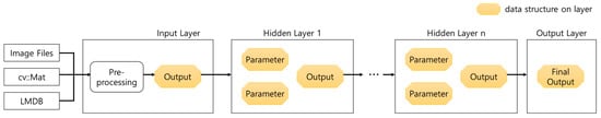 The input layer supports the Mat object of OpenCV [], in addition to image files in JPEG or PNG formats being appropriate for an on-device inference environment. Processing the data captured in the actual environment by converting them to image files is inefficient in on-device environments. Furthermore, the Lightning Memory-Mapped Database (LMDB) [] is supported as an input to use multiple image files efficiently during training. In addition, the input layer supports pre-processing, such as mean subtraction and normalization, and can be easily used through C++11-based user APIs.