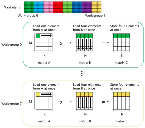 Figure 5 illustrates the schematic diagram of the parallel processing of GEMM_NN, which is the LEVEL 3 routine of BLAS using OpenCL in our framework. GEMM_NN is the case in which matrices A and B are not transposed in GEMM. GEMM_NN executes the multiplication of matrices A and B, in which the value of one row in matrix A is read and multiplied by all the values read in matrix B. Next, n data values are continuously loaded from columns in matrix B using vloadn. Furthermore, n data values are simultaneously processed using vloadn and vstoren in matrix C, because the column position for loading data in matrix B corresponds to the column position for storing the result values in matrix C.