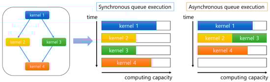 Figure 6 shows the differences between the synchronous and asynchronous queue executions. In the synchronous queue execution method, each kernel is sequentially executed, regardless of the processing capacity of the computing device. In contrast, the asynchronous queue execution method can simultaneously process commands if the processing capacity of the computing device is sufficient, and the executed kernels are independent. Kernel2 and kernel3, in the example, use the output of kernel1 as input, but the operation results do not affect each other. Moreover, OpenCL can process independent tasks simultaneously because it supports task parallelism. Owing to these characteristics, our framework applies asynchronous queue execution to allow independent kernels to be processed simultaneously.