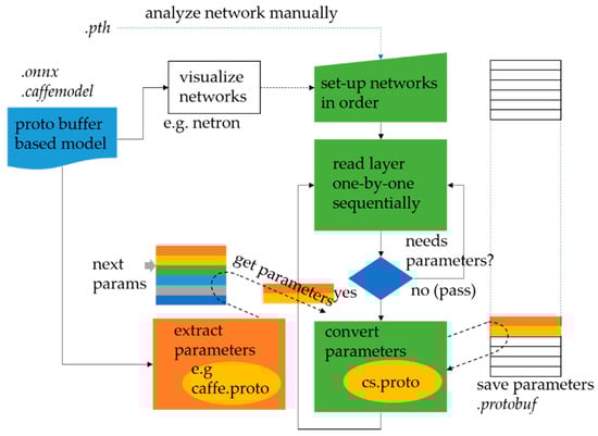 - An on-device utility for compatibility provides a function for converting models that are trained in other frameworks, such as Caffe, PyTorch, or open neural network exchange (ONNX) [] into our on-device framework. Moreover, it supports a function for automatically resetting the network by parsing the protocol buffer-based network configuration files.
