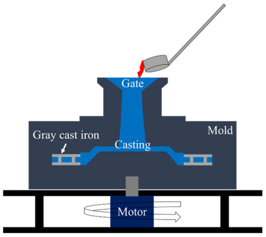 Schematic of vertical centrifugal casting apparatus used in this experiment. Rotation direction is counterclockwise.