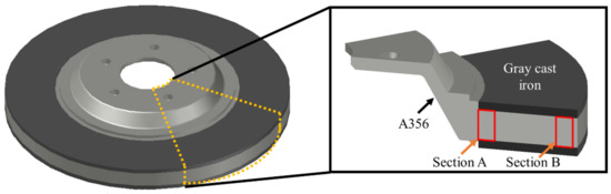 Schematic of gray cast iron–A356 hybrid brake disk after casting; investigated locations in brake disk are highlighted. Section A is closer to the center of rotation than section B.