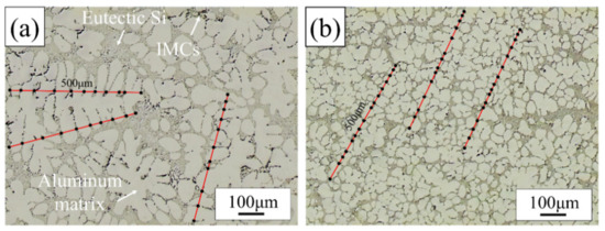 Optical microscopy images of non-heated A356 alloy; crosslines in the images indicate measurements of secondary dendrite arm spacing. (a) section A and (b) section B. Section A is closer to the center of rotation than section B.