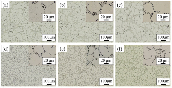 Optical microscopy images of heat-treated A356 alloy: (a–c) section A; (d–f) section B; (a,d) ST-E, (b,e) ST-WQ, and (c,f) ST-WQ-AG (section A is closer to the center of rotation than section B).