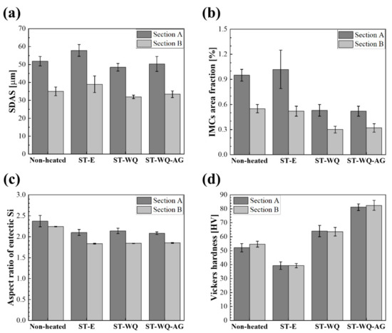 - In the ST-WQ (T4) heat-treated A356 alloys, the SDAS was decreased by 3.1 μm, compared to the non-heated alloys. In addition, the area fraction of the Fe-rich IMCs decreased by 0.25. This decrease occurred because the Mg solute atoms included in the π-AlMgFeSi phases were re-dissolved into an aluminum matrix. This caused the average hardness to increase by 11 HV. Moreover, the difference in area fraction of Fe-rich IMCs between section A and section B was reduced from 0.42% to 0.2%.