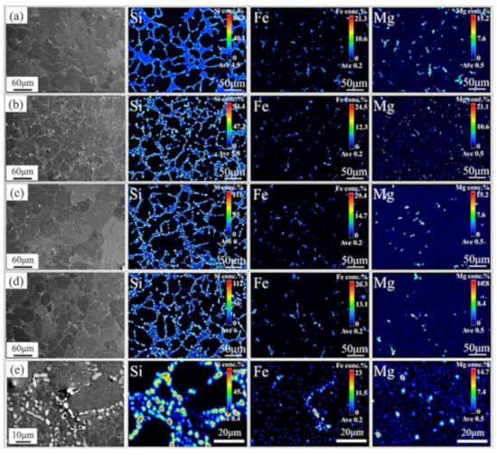 Figure 6 shows the quantitative analysis of section B. The A356 alloy contained eutectic Si phases and Fe-rich IMCs (π-AlMgFeSi, β-FeSiAl) around the Al matrix. The Fe-rich IMCs were identified by EDS and were divided into a gray π-AlMgFeSi and a needle-shaped light-gray β-FeSiAl phase (Figure 7c). After ST-WQ and ST-WQ-AG, π-AlMgFeSi phases were transformed into β-FeSiAl phases owing to the low melting temperature of the Mg solute atoms. Differences in the sizes and morphologies of the β-FeSiAl phases were not observed. The eutectic Si in the non-heated A356 alloys was present with a relatively uniform concentration. However, the concentrations of Si solute atoms constituting the π-AlMgFeSi and β-FeSiAl phases were slightly increased.