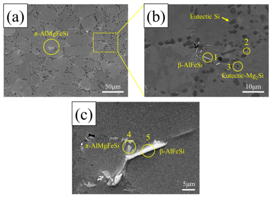 Field-emission scanning microscopy images of samples after ST-E heat treatment: (a,b) located in section B, and (c) representative phases of π-AlMgFeSi and β-FeSiAl in these A356 alloys. Chemical compositions of these points are shown in Table 3.