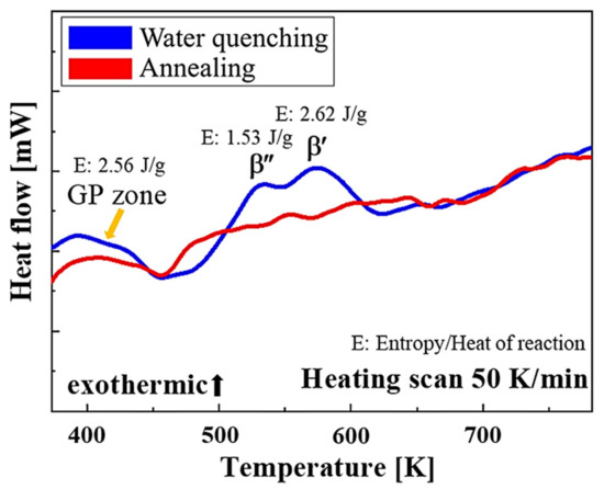 The samples were treated with the solid solution for 10 h at 813 K, followed by cooling at different rates (water quenching and annealing) to analyze the strengthening mechanism after the AG heat treatment. Subsequently, 13 ± 0.5 mg of each sample was cut and placed in a pellet-shaped capsule. Differential scanning calorimetry (DSC; N-650, SCINCO.) was performed at a heating rate of 50 K/min in a 40 cc/min flow of Ar.