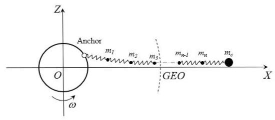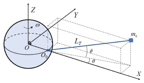 The typical space elevator system model comprises a tether, climbers and a zenith anchor. It can be considered that the anchor point of the tether is at a fixed location while the system oscillation has little impact on the floating platform. The centrifugal force would pull the tether perpendicular to the Earth’s axis while the tether would also droop toward the equator owing to gravity, which points to the center of the Earth. The space elevator system model is depicted in Figure 1. The center of the Earth O is assumed to be inertially fixed and is used as the origin of the inertial frame. is the anchor point of the tether on the earth’s equator. The X axis points from point O to point and is perpendicular to the ground. The Z axis points to the North Pole along the Earth’s rotation axis. The Y axis is perpendicular to the X axis and Z axis, is the angular velocity of the system is equal to the rotation rate of the Earth. is the nominal (unstressed) length of the tether. is the mass of the counterweight at the end of the tether. is the angle between the projection of the rope of the space elevator system in the XY plane and the X axis. is the angle between the projection of the rope of the space elevator system in the XY plane and itself.