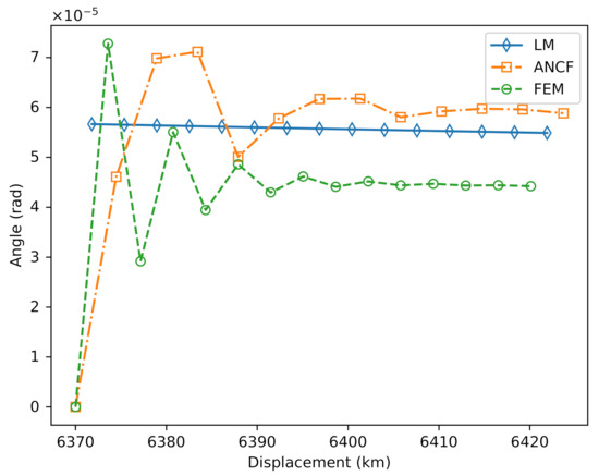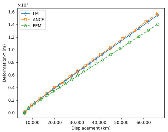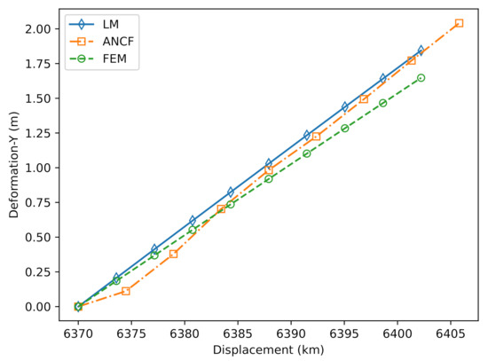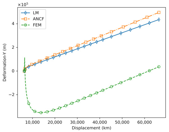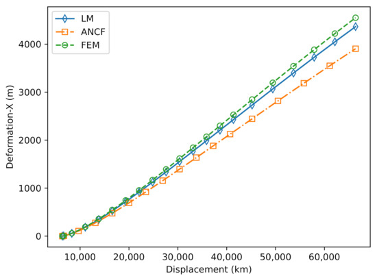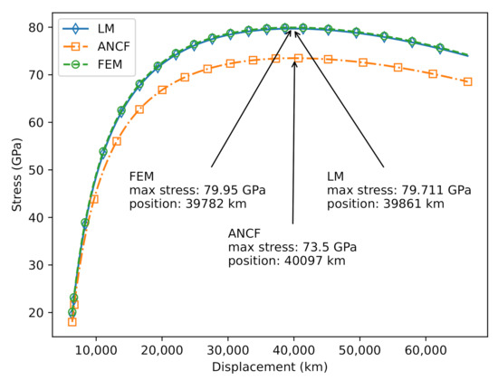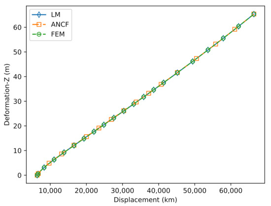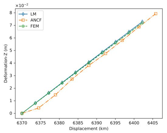 In Figure 6, it can be observed that the trend of the results calculated by the three methods is roughly the same. The stress results of FEM and LM are very close: the maximum stress point is around the geosynchronous orbit, and the value around 80 GPa. The result of ANCF is little smaller than the others. This is because the deformation represented by LM and FEM is Cauchy stress and true strain, which is defined by studying the force acting on an infinitesimal area element in a deformed body. Both the force component and the normal of the region have a fixed direction in space. This means that if the stressed object is subjected to pure rotation, the actual value of the stress component will change. The initial uniaxial stress state can be transformed into a total tensor containing normal stress and shear stress components. On the other hand, ANCF use Green–Lagrange strain to represent deformation, which contains the displacement derivative relative to the original configuration. Therefore, these values represent the strain in the material direction, similar to the behavior of the second kind of Piola Kirchhoff stress. However, it must be recognized that, even for the uniaxial case, the Green–Lagrange strain is strongly nonlinear relative to the displacement. If an object is stretched to twice its original length, the Green–Lagrange strain is 1.5 in the stretching direction. If the object is compressed to half its length, the strain will be −0.375. Thus, in Figure 7, the deformation of x-axis of ANCF is little smaller than the other results.