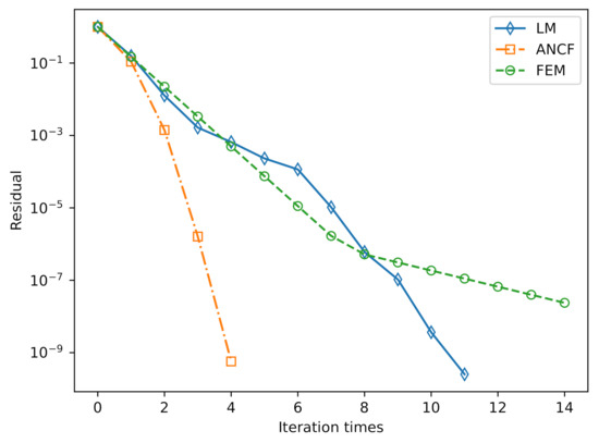 It can be found that the ANCF method has the fastest convergence speed and a trend of accelerating convergence, followed by LM, and the FEM is the slowest.