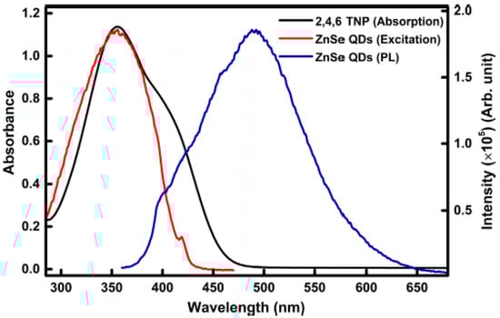 Spectral overlapping of the absorption spectrum of 2,4,6 TNP with PL and the PL excitation spectra of ZnSe QDs [25].