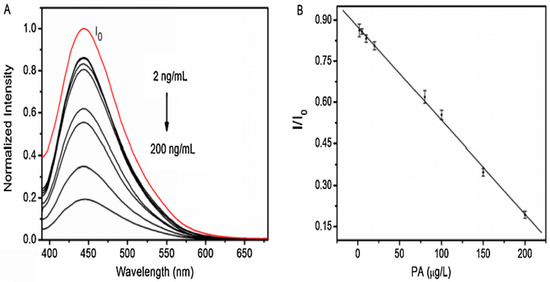 (A) Fluorescence emission spectra of BSA/creatinine/N-GQDs–chitosan solid film in the presence of PA at 0 (red line I0), 2, 5, 10, 20, 80, 100, 150 and 200 ng/mL (from top to bottom). (B) Stern–Volmer curve. I and I0 were the fluorescence intensities of BSA/creatinine/N-GQDs–chitosan fluorescent solid film at 360 nm in the presence and absence of PA, respectively [57].