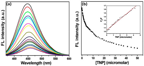 (a) FL behavior of N-GQDs in the presence of various TNP concentrations (from top to bottom (0–50 M)). (b) FL emission curve of N-GQDs with increased concentration of TNP (inset: Stern–Volmer plot for the quenching process) [59].