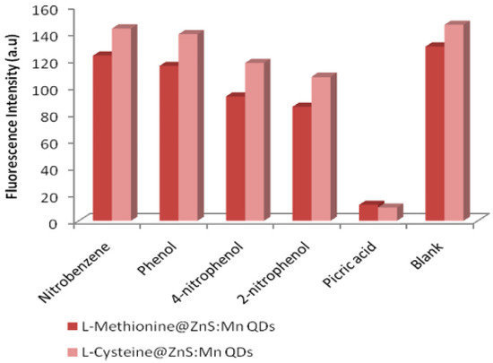 Reports have shown that the selectivity and sensitivity of sensors can be enhanced through surface modification, which can be done by functionalizing the material or conjugating it to a material that has an affinity for the pollutants of interest [62]. The effective detection and differentiation of pollutants can be done by conjugating QDs to different molecules such as graphene derivatives, polymers, proteins, enzymes, nucleic acids, etc. [27]. Peveler et al. studied the multi-channel detection and differentiation of explosives [63]. The functionalization of QDs’ surfaces has been reported to affect the recognition properties, which have an effect on the sensitivity and selectivity [63]. Recently, Aswathy et al. exploited the quenching efficiency of sulfur-containing amino acids such as L-cysteine and L-methionine. The modified QDs were found to be selective and more sensitive towards picric acid. The energy transfer between the QDs and the TNP is ascribed to the acid–base reaction. From Figure 4, it was observed that L-cysteine-capped ZnS-Mn2+ QDs gave a higher quenching efficiency than those that were L-methionine-capped. However, the cause of this difference was not explained. These results could mean that the quenching efficiency is dependent on the structure of the functionality or the surface chemistry of the amino acids [64].