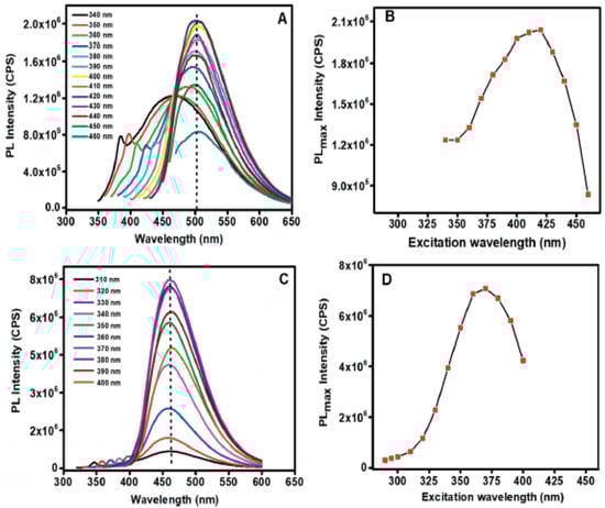 The effect of excitation wavelength on the emission spectra of (A) GO-GQDs and (C) CA-GQDs. (B,D) the effect of excitation wavelength on the maximum PL intensity (PLmax) in each case.