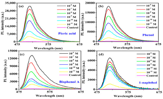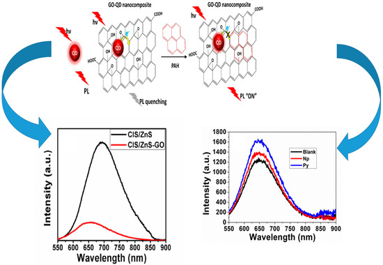 Graphene, graphene oxide (GO) and reduced graphene oxide (rGO) can be easily combined with semiconductor QDs to form composites with enhanced sensitivity and selectivity towards the detection of organic pollutants [85]. Graphene, GO and their composites have been widely used for wastewater treatment because of their high adsorption capacity. The π-electron system of graphene and its derivative make them suitable modifiers of QDs for the fluorescence detection of π-electron-rich organic pollutants. Mitra et al. (2016) explored rGO-based sensors for the fluorescence detection of both PAH analytes and NACs. The results of their study showed an enhancement of PL intensity of the sensor by the pollutants (Figure 6) [67]. In 2016 and 2017 Adegoke et al. investigated the selectivity and sensitivity of a QD–GO composite for the detection of PAHs [4,60]. Their study showed that PAHs could be detected by a QD–GO composite through an enhancement mechanism. Recently, Liu et al. synthesized CuInS2 quantum dot (QD) and graphene oxide (GO) nanocomposites as a fluorescent sensor for the detection of kanamycin [82].