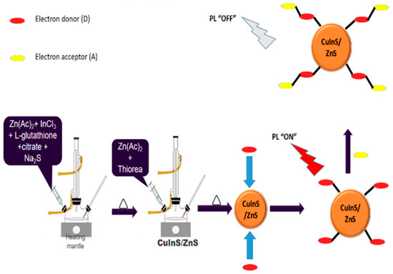 Ternary QDs exist in different groups, such as CdSeTe, CdZnSe, CuInX2 (X = S, Se and Te) AgInX2 (X = S, Se and Te), etc. However, current research is being focused on cadmium-free ternary QDs because of their low toxicity [16,26]. Ternary QDs can be synthesized in two ways, namely an organic route and an aqueous route (which can be further divided into two approaches: direct synthesis and ligand exchange). However, there have been challenges in synthesizing ternary QDs due to the uncontrolled reactivity of the cationic precursors of In3+ and Ag+ or Cu+, which can lead to the formation of undesired products such as indium sulfides. Different studies on their synthesis have shown that this challenge can be overcome by (1) the use of dual stabilizers and (2) the use of a single precursor (that can produce both In and Cu or Ag) [27]. Furthermore, the reactivity of the cationic precursors in an organic medium can be balanced through the use of either single stabilizer or dual stabilizers [28]. Their optical properties are said to be dependent on the optimization of different parameters, including (i) the type of stabilizers, (ii) refluxing time, (iii) type or amount of dopants [29] and (iv) the type of synthetic method [30]. Apart from being environmentally friendly, these fluorescent probes exhibit two major outstanding properties: direct bandgaps and absorption coefficients as large as 10−5 cm−1 [16,31]. However, these semiconductors suffer from surface defects, which are undesirable in sensing applications since they result in self-quenching. This challenge can be addressed by coating the core semiconductor with another semiconductor referred to as the shell [32]. While QDs have great potential as fluorescent probes in the sensing of organic molecules, the affinity of their surfaces for the target molecules must be improved. Recently, a few studies on the improvement of their affinity for aromatic compounds have been reported. In 2021, Maluleke et al. reported the synthesis of graphene oxide (GO)-modified CuInS/ZnS QDs for the sensing of PAHs. The addition of different concentrations of PAHs to the GO-modified QDs has shown enhancement of photoluminescence (PL) intensity. This enhancement was ascribed to the π-π stacking between the chemical sensor and the PAHs [33].