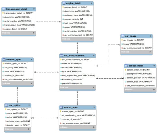 Developing the application using relational MySQL database involves the structure presented in Figure 2, where the car_announcement entity has a @OneToOne relationship with the exterior_spec, interior_spec and engine_detail entities and a @OneToMany relationship with the sensor_detail and car_image entities. Additionally, exterior_spec and interior_spec entities have a @OneToMany relationship with the car_option entity, while engine_detail has @OneToOne relationship with the transmission_detail entity (Figure 2).
