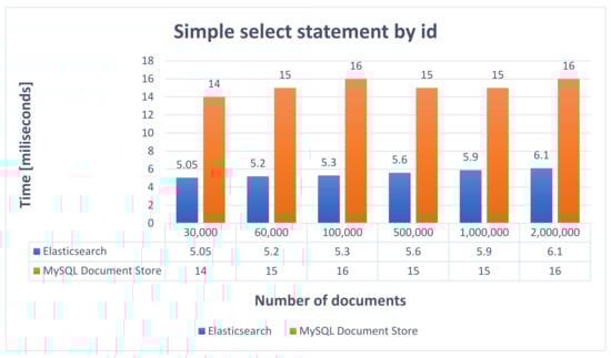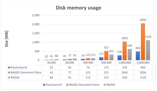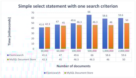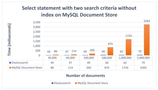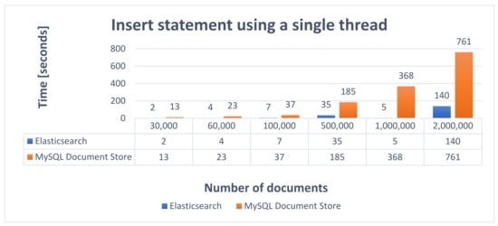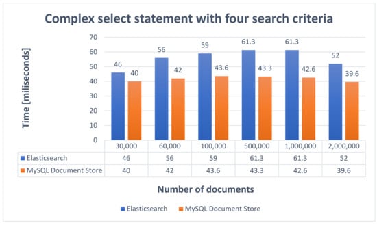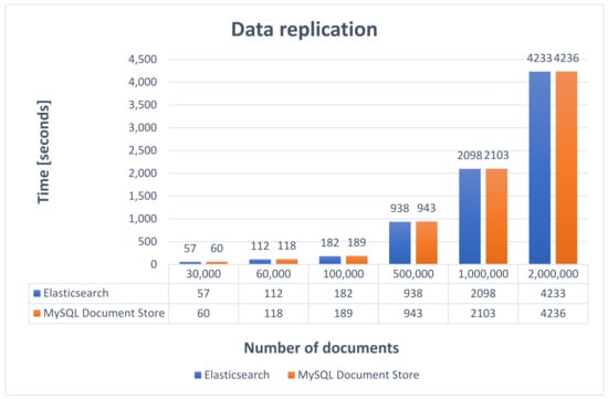 Consequently, it offers many possibilities to configure the way of data processing and simplify the application logic because the indexing process is performed by BulkProcessor, which will receive the indexing requests. Therefore, ElasticSearch exhibits very good performance, the average replication time being 1270 s. On the other side, MySQL Document Store requires the implementation of a data processing strategy and implies writing extra code to replicate data. The resulting implemented solution generally does not offer as many configuration possibilities as BulkProcessor. However, it also exhibits very good performance, close to Elasticsearch, the average time obtained to replicate data being 1274.8 s.