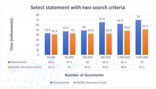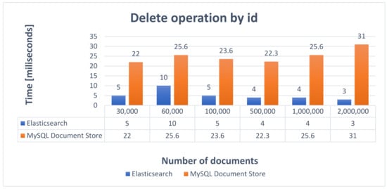 A more complex statement that deletes multiple documents is presented in Table 9, and the obtained performance results are described in Figure 15. During the process of deleting multiple car announcements by id, for every amount of data 30 car announcements were deleted and major time differences can be noticed between Elasticsearch and MySQL Document Store.