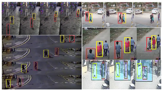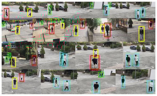 Frames of different videos from the Sogang Tailing Dataset (STD). Suspect: Red rectangle, Victim: Yellow rectangle, Pedestrians: Green rectangle, Volunteers mimicking a non-tailing event: Cyan rectangle.