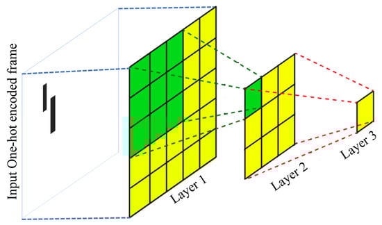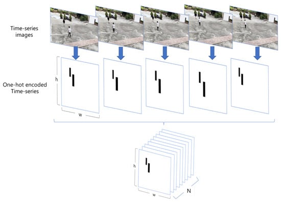 In image classification, the convolutional neural networks learn and classify object patterns from 3-channel images [41]. To learn the pattern in time-series images, we accumulate the one-hot encoded frames over time as shown in Figure 2, and used it as the input to the convolutional neural network.