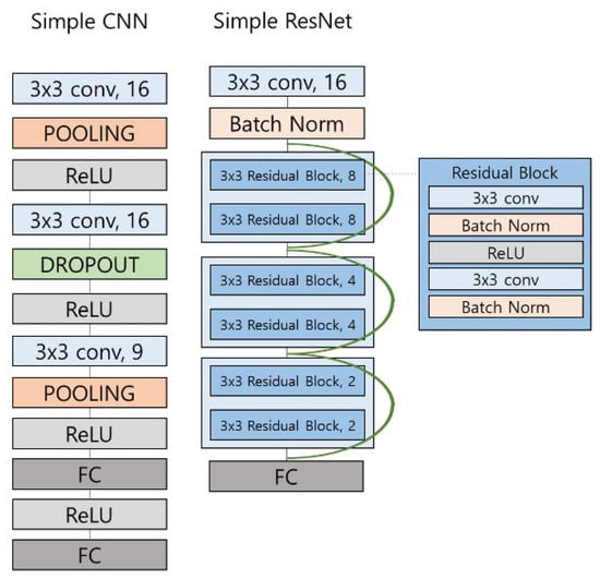 To observe the effects of the depth of the CNN on the tailing detection performance, we experimented with time-series images using a simple-CNN and a ResNet [42] architecture. Figure 3 shows the simple-CNN and ResNet architectures. Simple-CNN consists of three convolution layers and two fully connected layers. Simple-ResNet consists of three connection blocks. Each connection block consists of two residual blocks, which are composed of convolution, batch normalization, and activation layer as shown in Figure 3. With this simple-ResNet architecture, we focus on two factors. First, we want to check whether the residual block shows good performance on time-series data. Second, we want to reduce the size of the model to optimize memory usage. We also experimented with the original ResNet architecture to analyze the relationship between network size and performance. The input channel of the first convolution layer of all ResNet is changed to the number of accumulative frames, N, in Figure 2.