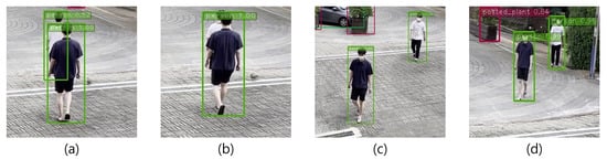 The rule base method achieved 61.45% of accuracy with 77.73% precision and 53.48% recall. Due to differences in camera angles and perspective effects, the rule-based method did not use normalized coordinates. Since rule-based methods are sensitive to noise, it is difficult to expect high detection accuracy. Figure 6 shows the example cases where the handcrafted rule-based method fails. Figure 6a,b depicts the situation where the spatial information becomes corrupted due to Figure 6a overlapping, and Figure 6b occlusion. However, Figure 6c,d illustrate the perspective effect, i.e., the distance between the victim and suspect is same in both Figure 6c,d but due to perspective difference, the distance between the victim and suspect appears different in Figure 6c,d. Handcrafted rule-based method shows poor tailing detection results in these situations.