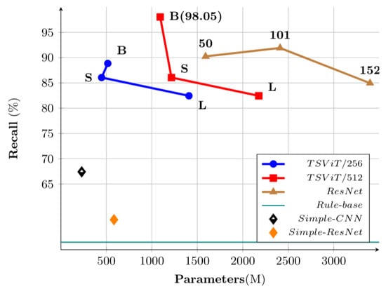 The overall comparison of Table 1 and Table 3 reveals that the proposed TSViT method outperform all CNN-based models. Transformer-based “Base” model TSViT-B/512 exhibits the best accuracy of 76.56% in comparison with the 63.54% best accuracy of simple-CNN, a 13.02% improvement. Similarly, the recall is improved from 91.92% of ResNet-101 to 98.05% of the TSViT-B/512 model, even with the smaller model size (1092 M vs. 2410 M parameters). This shows that the transformer can have better inductive biases compared to CNN by using temporal information in a better way of embedding time-series data frame by frame. Third, the performance of Transformer-based models increases as the input frame size is increased. This is because the self-attention layer in the transformer embeds positional information from the input image [50], and thus, higher resolution translates to more accurate positional embedding.