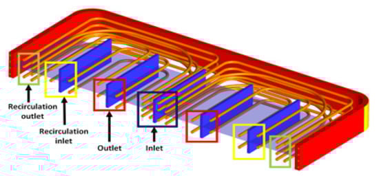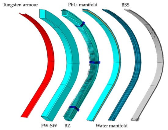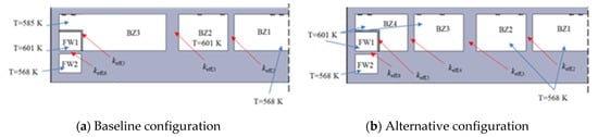 Figure 12), accounting for two possible coolant flow paths in the BZ—one foreseeing the recirculation (baseline) and one not (alternative). Then, for both geometries, the thickness of the walls separating the different manifolds was varied, and the heat transfer was computed using the GETTHEM 1D thermal-hydraulic model. In order to derive correlations between the thermal resistance and wall thickness, a set of 2D FEM analyses was run using the FreeFem++ software. The presence of the PbLi manifold and the radiation towards the VV (supposed to be at the uniform temperature of 40 °C) were considered as well. The obtained results showed that the walls provided sufficient thermal insulation between the different manifolds in all the considered configurations—both in the baseline and alternative geometries. The parametric campaign on the manifold thicknesses highlighted that the heat transfer among the different manifold channels could be considered negligible: in fact, the reduction of the coolant temperature at the BB outlet was well below 1 °C (which was comparable with an estimated 3% accuracy of the GETTHEM models [