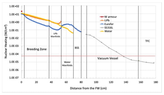 As an example, the radial distribution of a nuclear heating density radial distribution for the inboard region is depicted in