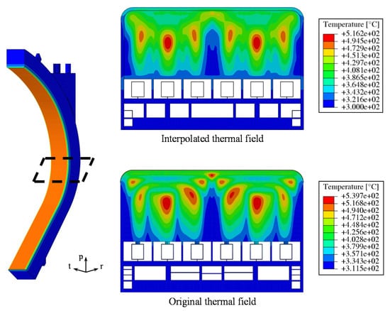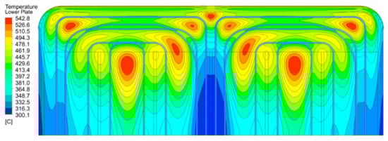 Figure 7. The only region where the temperature of 550 °C was found to be overcome is the baffle plate domain, where the maximum temperature was predicted to slightly exceed the limit, being equal to 552 °C. However, since this component has no structural functions, this slight overrun is considered to be acceptable.