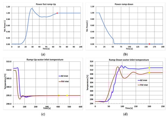 The same type of loads and boundary conditions adopted for steady-state analyses already reported in the previous sub-section were adopted for transient calculations. The only difference was represented by the heat power and water inlet temperature values. Their behaviours during the ramp-up and ramp down phases are plotted in