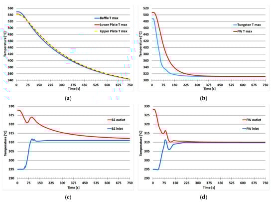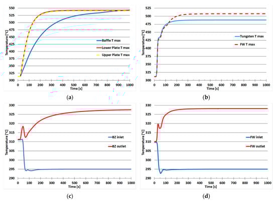 Figure 9b). The main goals of this analysis were to evaluate the maximum EUROFER temperature trend in order to verify that the elementary cell returned to an isothermal dwell condition in the expected 650 s and to verify that the BZ and FW water outlet temperatures met the primary heat transfer system (PHTS) requirements.
