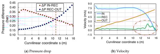 Figure 14b as a function of the curvilinear coordinate. The average velocity in the IM did not remain constant, potentially due to the reduction of the manifold flow area, but was significantly reduced in the upper part of the segment. The average speed in the OM monotonically increased from the bottom to the top. However, in the REC manifolds (with the exception of the upper part of the manifold, where a sudden reduction of the flow section was faced due to some oscillatory behaviour) a very small net velocity was computed. When the net longitudinal speed was converted into a net mass flow rate, it was found that it monotonically decreased in the IM and monotonically increased in the OM. Meanwhile, a small net flow rate was computed in the REC, though only before the flow area reduction.