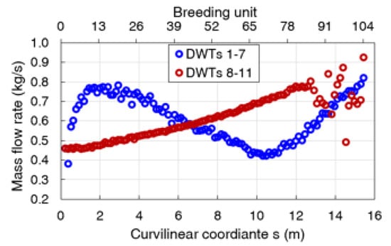 Concerning the different cells, the mass flow rates in the two different equivalent porous pipes (the first mimicking DWTs 1–7 from IM to REC1, the second mimicking DWTs 8–11 from REC2 to OM) are reported in