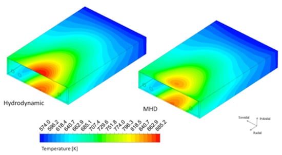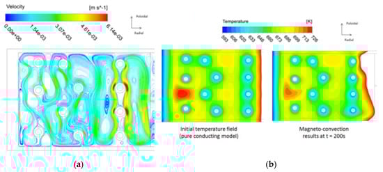 Figure 18 depicts the velocity stream lines and temperature contours in the central radial–poloidal plane obtained in the transient simulations after 200 s. The presented results correspond to a situation with a moderate Hartmann number (Ha = 1000). The gravity field was adjusted to maintain the actual ratio between buoyancy and Lorentz’s forces. This was done because it was found that, with the employed mesh, it was hard to preserve stability and charge conservation for Ha values higher than 3000.