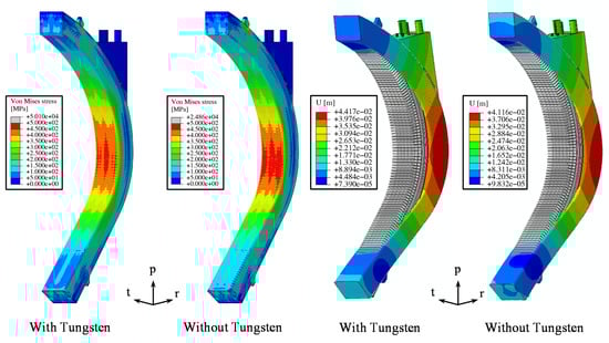 Finally, concerning the displacement field, a remarkable displacement along the radial direction was observed. This trend was probably due to the fact that the attachment system did not use any support in the equatorial region to prevent the radial displacement of the segment, thus showing a very large deformation. In addition, the configuration with the W armour showed the highest maximum displacements values. As an example, displacement fields, with an isotropic amplification factor equal to 30 superimposed on the un-deformed layout, are reported in the right part of