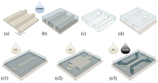 In order to study the electric field influence on LC molecular orientation, the LC:PDMS systems were featured with electrodes (see Figure 1(e3)) in the form of microchannels filled with the high-purity eutectic gallium–indium (EGaIn, from Sigma-Aldrich). This electrically conductive fluid metal (with a resistivity of 29.4 × 10−6 Ω·cm) comprises 75.5% gallium and 24.5% indium by weight. Its low viscosity and rheological properties at room temperature allow for the formation of metal electrodes within the microchannels with adequate cross-sectional dimensions [49].
