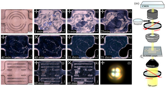 (a,i) Photographs of the empty PDMS:PDMS cells applied to determine the liquid crystalline alignment on the PDMS surface. Thin PDMS sub-pillars of semi-cylindrical (a) and rectangular (i) shapes are visible in the central part of the cell. (b–h) POM images of the sample infiltrated with 5CB NLC taken after a particular time indicated on the bottom left corner of the photographs. (j,k) PDMS:PDMS cell with E7 NLC inserted in different angular positions between crossed polarizers and observed 60 min after infiltration. The black gridded pattern visible in some photographs is an artifact resulting from a photo-stitching procedure in the digital microscope. (l) Conoscopic image in the central part of the tested cells proving the homeotropic alignment. (m) Scheme of the polarization of the optical microscope. The passage from the typical orthoscopic mode to the conoscopic configuration is obtained by introducing a Bertrand lens between the ocular and the analyzer.