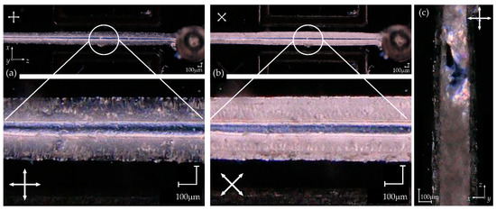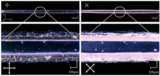 UV-cured photostencil film processing was the last non-photolithographic technique of mold fabrication to be tested for its ability of LC molecular alignment in the microchannels. The microchannel to be tested in the PDMS:glass architecture was designed to be 200 µm high and 200 µm wide. A much wider channel with a flat top but highly distorted sidewalls was achieved. After putting the LC material into the inlet, the planar molecular alignment was initially achieved for the volumetric flow rate varying in the range of 0.6–1.8 µL/min. Although material imperfections were visible near the sidewalls of the channels, the homeotropic alignment in the central part of the channel was achieved after 5 min from infiltration with E7 NLC. This observation may be confirmed by the photographs shown in Figure 5. Analogical results were obtained in the PDMS:PDMS structure when the PDMS layer was used as the substrate in place of the glass plate. The molecular orientation in the microchannels fabricated using the UV-cured photostencil film remained stable for days.