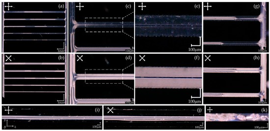 (a–h) POM images of the microstructures which were designed as the set of channels with different widths (from 50 to 250 µm in steps of 50 µm) and infiltrated with E7 NLC. The PDMS structures were fabricated using the mold micromilled in the PMMA material and then bonded with the substrate made of the PDMS layer (a–f) and the glass plate (g,h) The positioning of the samples with respect to the crossed polarizers is indicated in each photo. The zoom-in panels (c–f) show the middle right (i.e., channels with widths of 150 and 200 µm) and top left (i.e., channels with widths of 200 and 250 µm) parts of the structures, respectively. (e,f) Enlargements of the selected sections of the microchannels demonstrating the flow-induced orientation. (i–k) Images of a 200-µm-wide single microchannel in the PDMS:glass architecture about one hour (i,j) and a few days (k) after infiltration.
